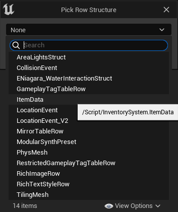 Data Table을 생성할 때, 'Pick Row Structure'창에서 C++로 구현했던 ItemData 구조체를 선택하면 아래의 이미지와 같이 생성됩니다.