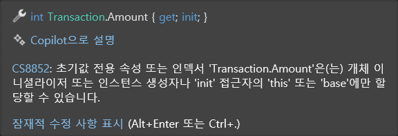 init 접근자는 set 접근자처럼 외부에서 프로퍼티를 변경할 수 있지만, 객체 초기화를 할 때만 프로퍼티 변경이 가능하다는 점이 다릅니다. init 접근자는 자동 구현 프로퍼티를 선언하면서 set 접근자 대신 init 접근자를 명시하면 됩니다.