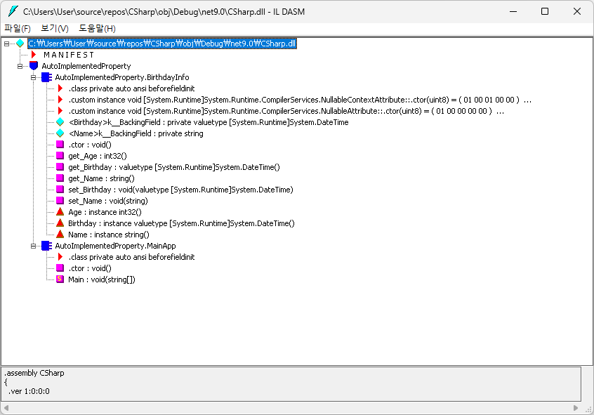 비주얼 스튜디오와 함께 제공되는 .NET 디어셈블리 도구인 ildasm.exe로 AutoImplementedProperty 예제를 열어보면, 아래의 이미지처럼 볼 수 있습니다.