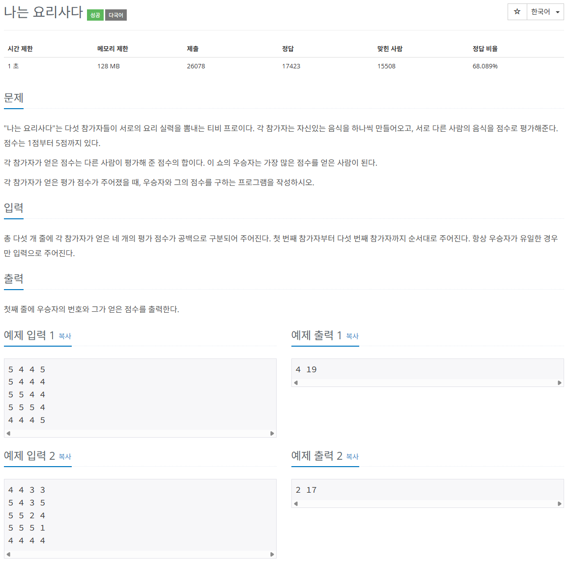 [BAEKJOON 2953번 : 나는 요리사다]