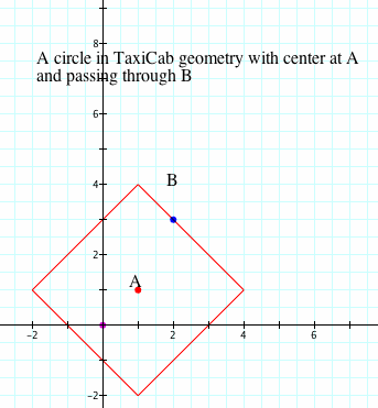 택시 기하학에서 원의 정의는 유클리드 기하학에서의 원의 정의와 같습니다. 그렇기에 반지름이 R인 원은 원점으로부터 택시 거리가 R 이하인 모든 점들의 집합입니다.