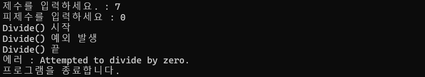 Console.WriteLine("Divide() 끝");