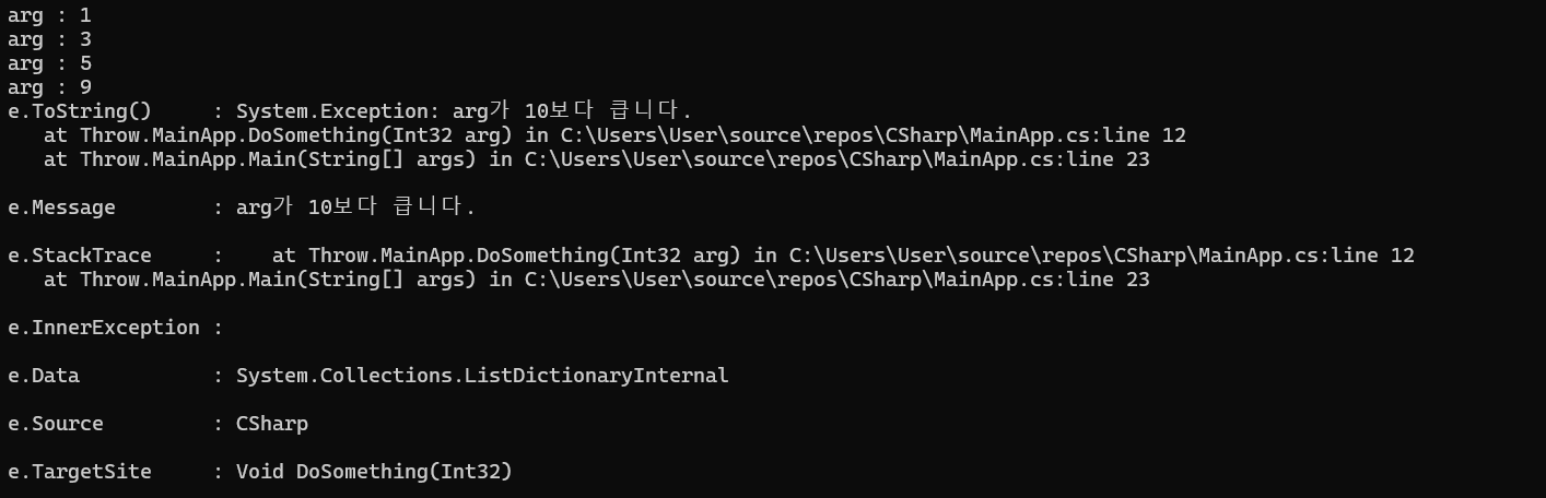 Console.WriteLine($"예외가 발생했습니다 : {e.Message}");