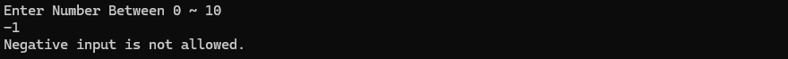 Console.WriteLine("Negative input is not allowed.");