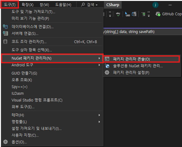 1. 비주얼 스튜디오 메뉴에서 [도구] → [NuGet 패키지 관리자] → [패키지 관리자 콘솔]을 엽니다.