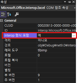 속성을 열어 [Interop 형식 포함] 항목 값을 "예"로 변경합니다.
