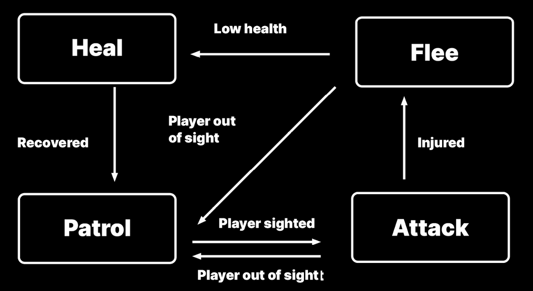 - 상태 패턴 기반으로 단순한 AI를 만들 수 있습니다.
