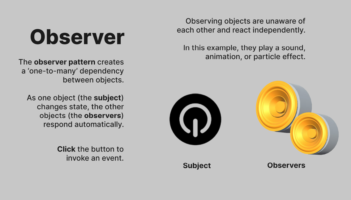 아래의 관찰자 샘플 씬에서 ButtonSubject는 사용자가 마우스 버튼으로 Clicked 이벤트를 호출하도록 합니다.