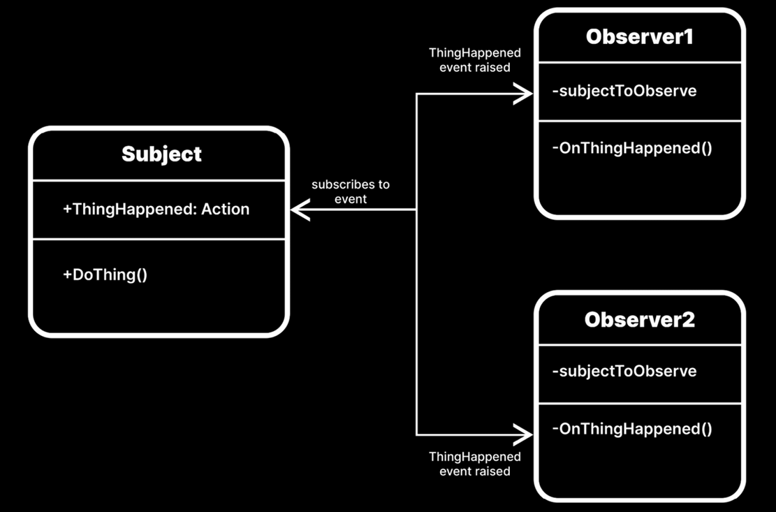 - 관찰자가 이벤트를 구독하려면, 그 이벤트가 어느 객체에 정의되어 있는지를 반드시 알아야 합니다.