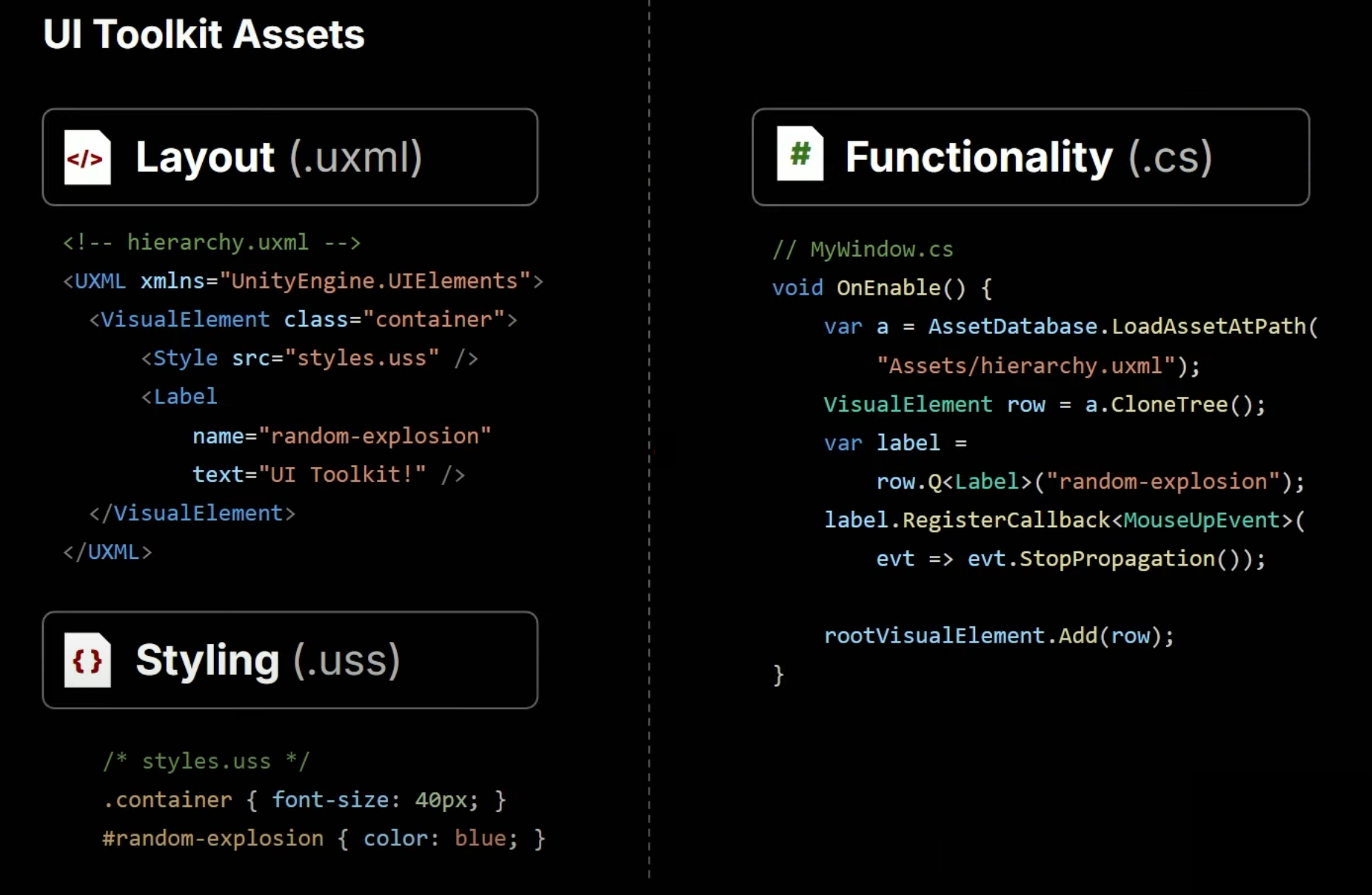 Unity의 UI Toolkit 시스템은 기존의 uGUI(Canvas 기반 UI)와 달리, 웹 기술에서 차용한 선언적 방식으로 UI를 작성할 수 있도록 설계되었습니다.