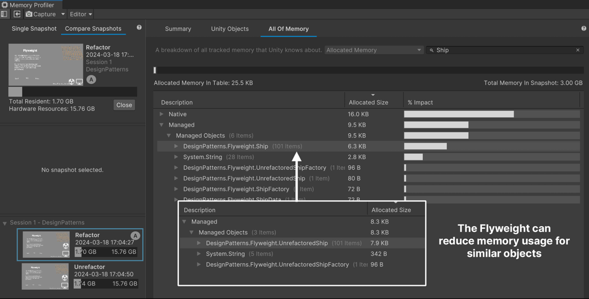 플라이웨이트 패턴이 적용됐을 때의 Memory Profiler를 통한 메모리 확인