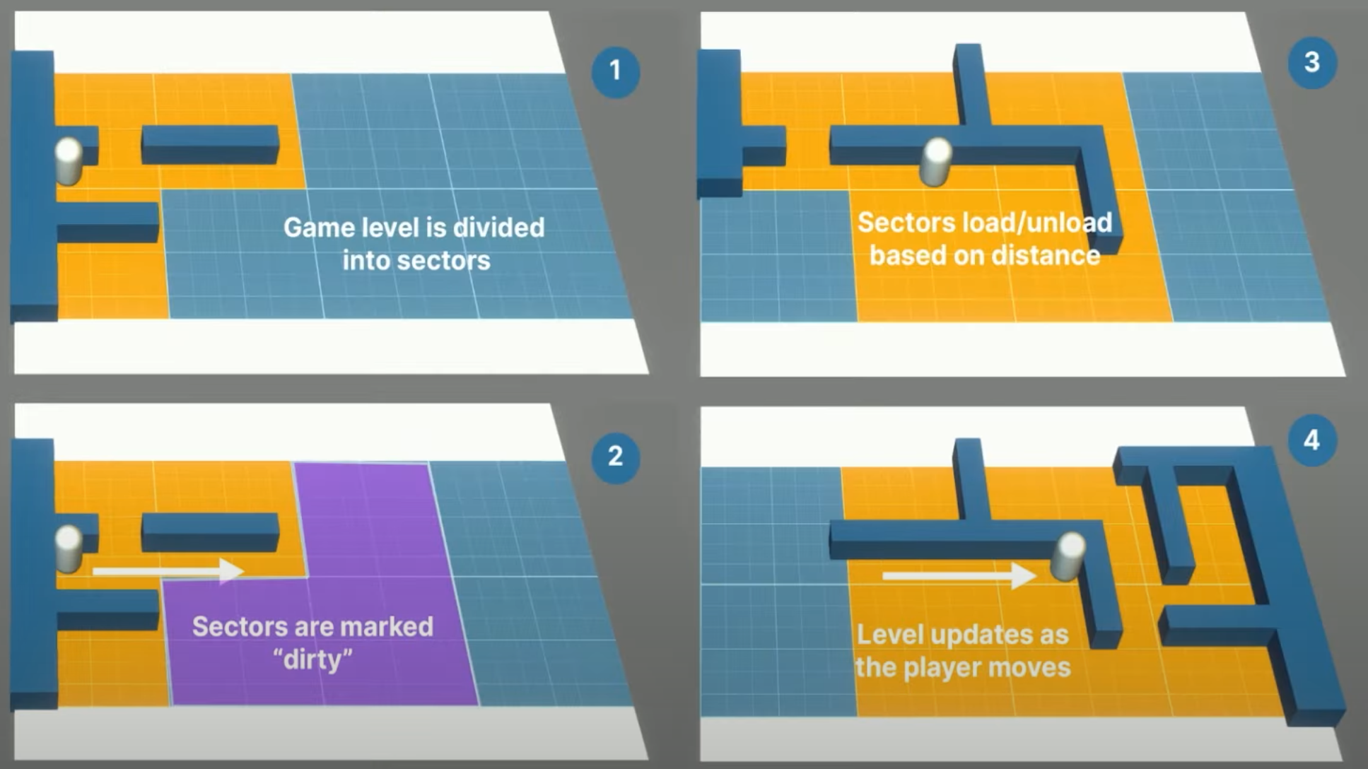 - 전체 게임 환경을 한 번에 로드하는 것은 리소스가 부족하기에, 플레이어가 현재 보고 있는 게임 세계의 일부만 로드합니다.